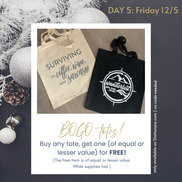 Cross a few gifts off your list! ALL totes - those you see here, as well as the bottle totes, etc. - are all on sale! (and BOGO!)